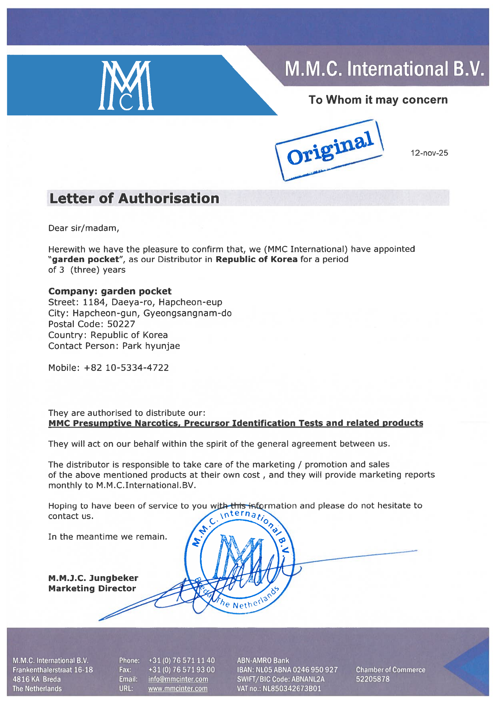 가든포켓은 M.M.C. International B.V.로부터 정식으로 대한민국 내 마약류 추정 검사키트, 전구체 식별 검사키트 및 관련 제품의 독점 유통권을 부여받았습니다.